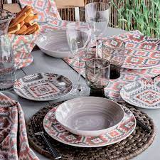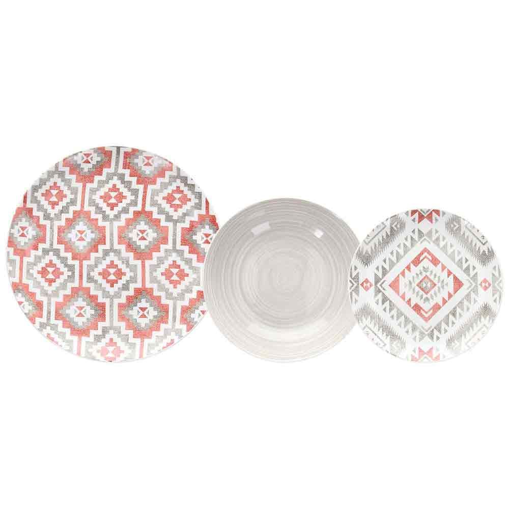 Servizio piatti in porcellana, con disegno geometrico color tortora e rosso.