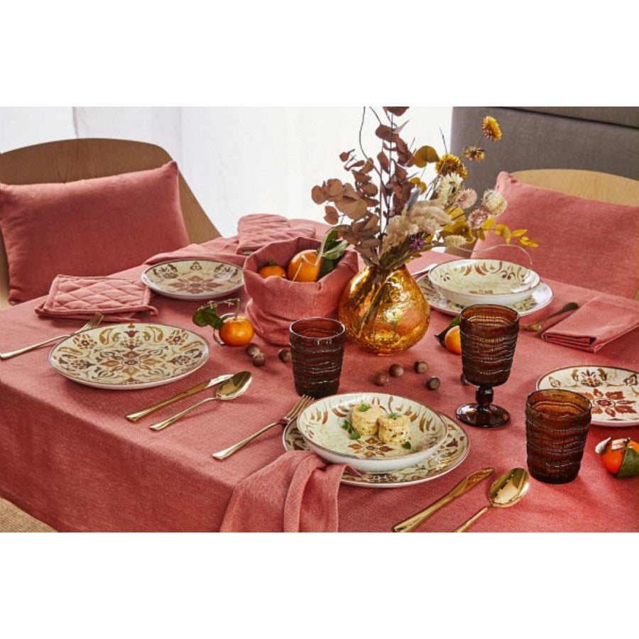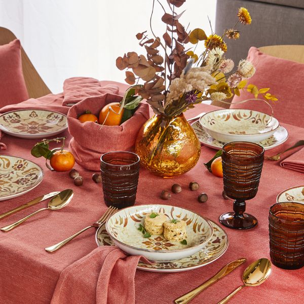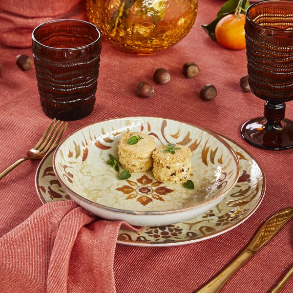Servizio piatti n porcellana con decoro floreale su sfondo beige.