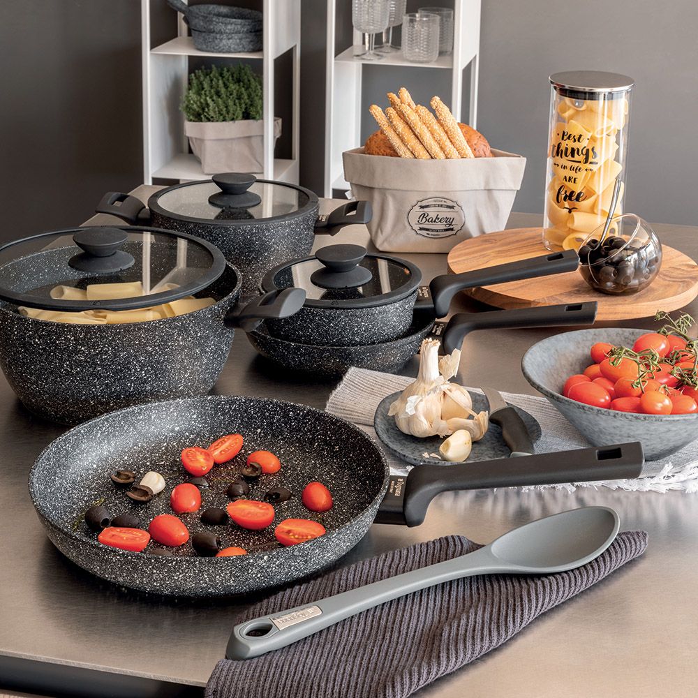 Strumento versatile immancabile in tutte le cucine per preparare qualsiasi pietanza, la batteria di pentole Authentika ha una finitura nera e grigia che ricorda una pietra scura. Il corpo è realizzato in alluminio forgiato riciclato e antiaderente, marmorizzato a 5 strati e rinforzato con particelle di minerali duri. Questa scelta garantisce alte prestazioni, in termini di antiaderenza e resistenza ai graffi e alle abrasioni. Il fondo ad alto spessore è adatto inoltre a tutti i piani di cottura, compresa l'induzione. La linea Authentika è PFOA Free e Nickel Free e permette una cottura sana e salutare. I manici sono in bakelite soft touch, anti-scivolo e anti-scottatura, con il logo Tognana Made in Italy impresso a laser su ghiera: un dettaglio prezioso che ne sottolinea l'autenticità. Lavabile in lavastoviglie.