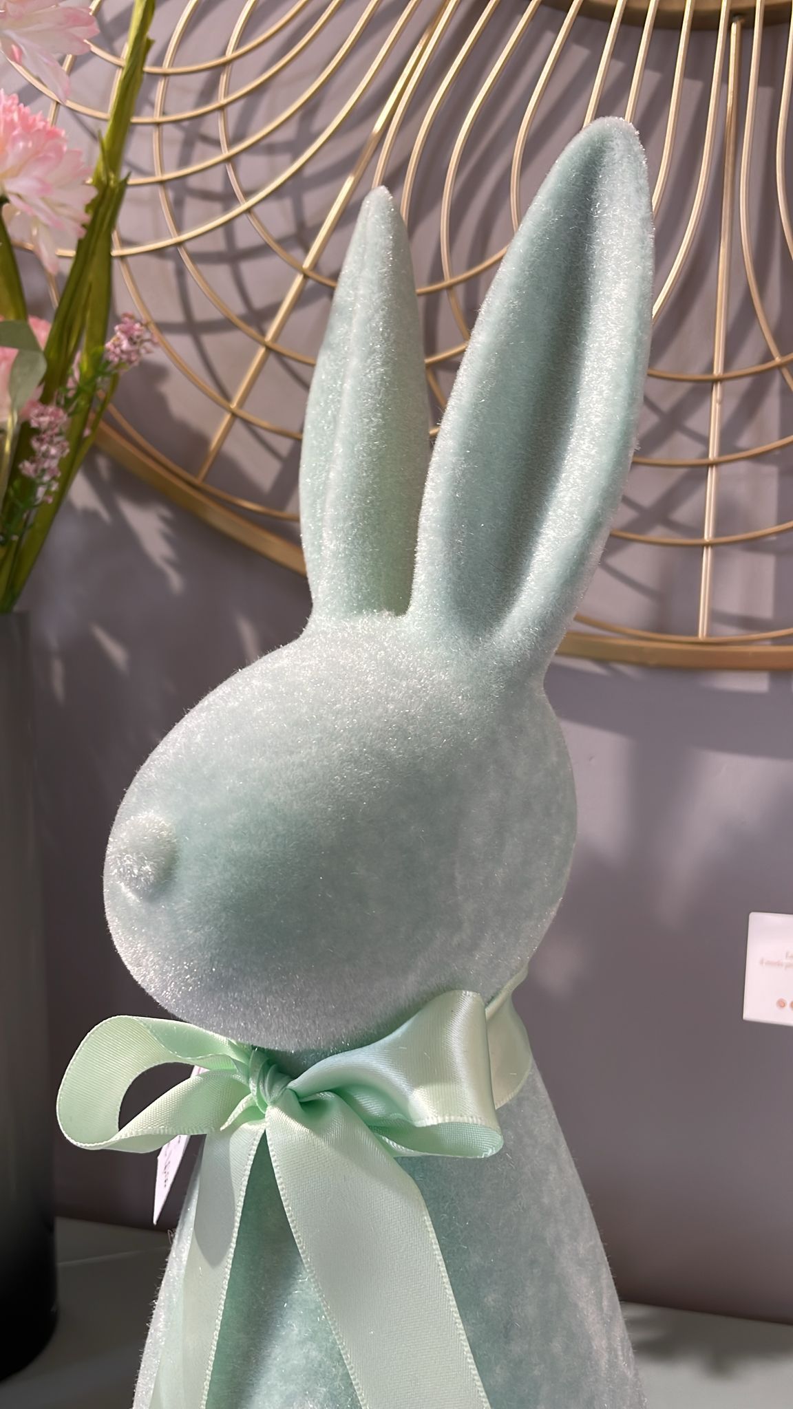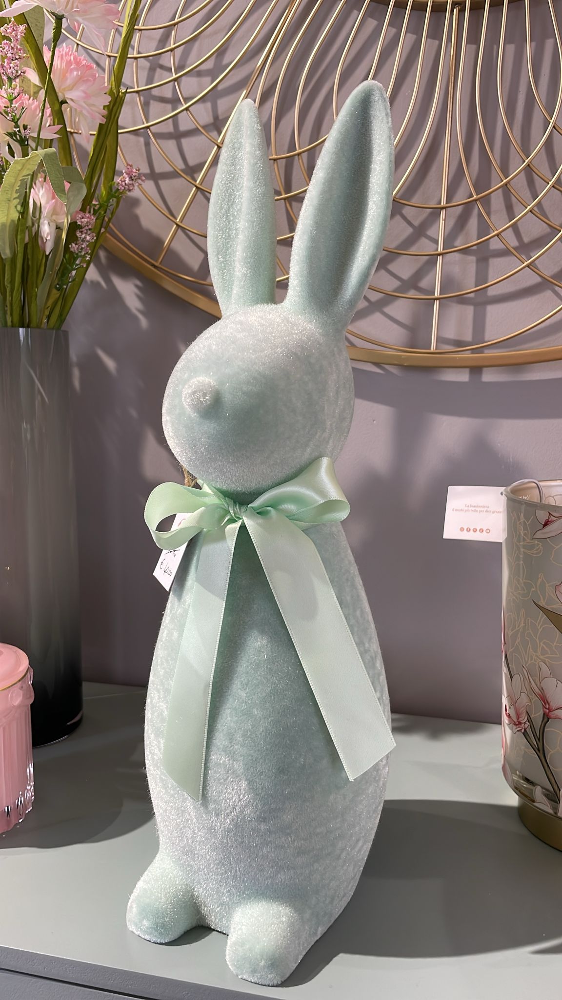 Coniglio verde in morbida plastica, rivestito in velluto per un tocco di eleganza. Perfetto per decorare la tua casa con un elemento vivace e raffinato. Assicura un design unico e originale, senza trascurare la qualità dei materiali. Non può mancare nella collezione degli amanti dell'arredamento.