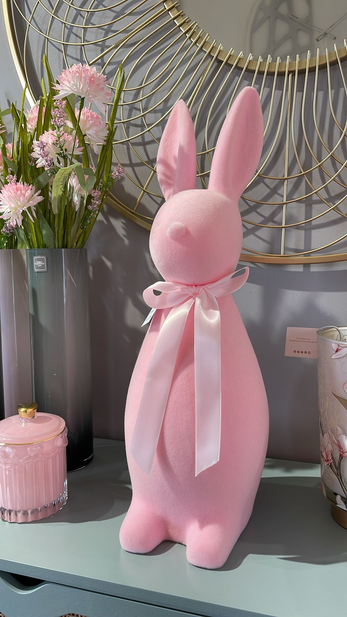 Coniglio rosa in morbida plastica, rivestito in velluto per un tocco di eleganza. Perfetto per decorare la tua casa con un elemento vivace e raffinato. Assicura un design unico e originale, senza trascurare la qualità dei materiali. Non può mancare nella collezione degli amanti dell'arredamento.