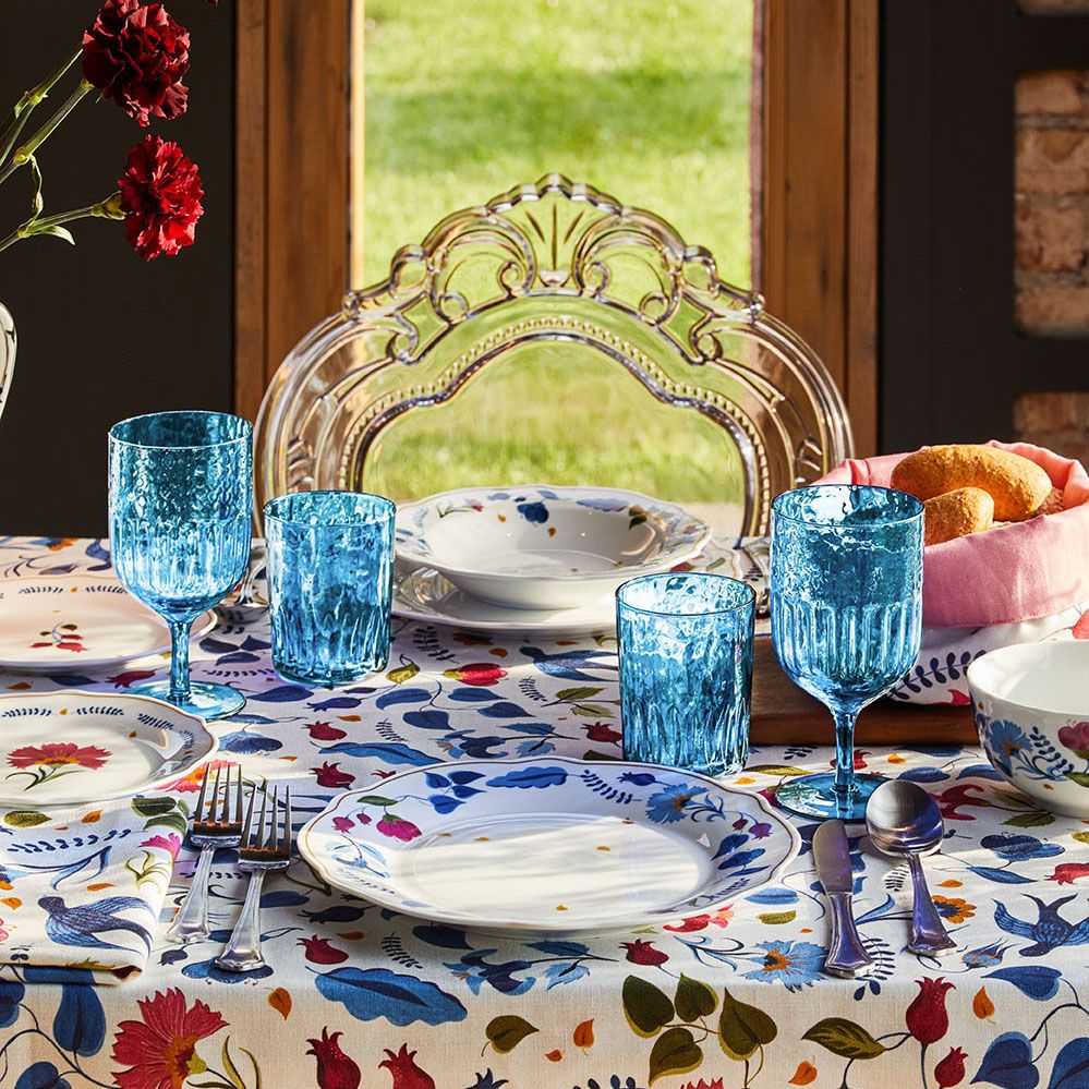 Servizio piatti in porcellana, con disegno floreale blu e rosso, bordo festonato con decoro ocra.