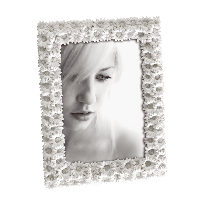 Portafoto in resina, con margherite a rilievo e rifinitura opaca.