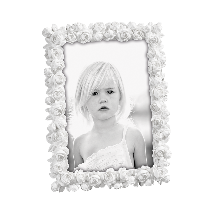 Portafoto in resina, con fiori a bocciolo in rilievo.