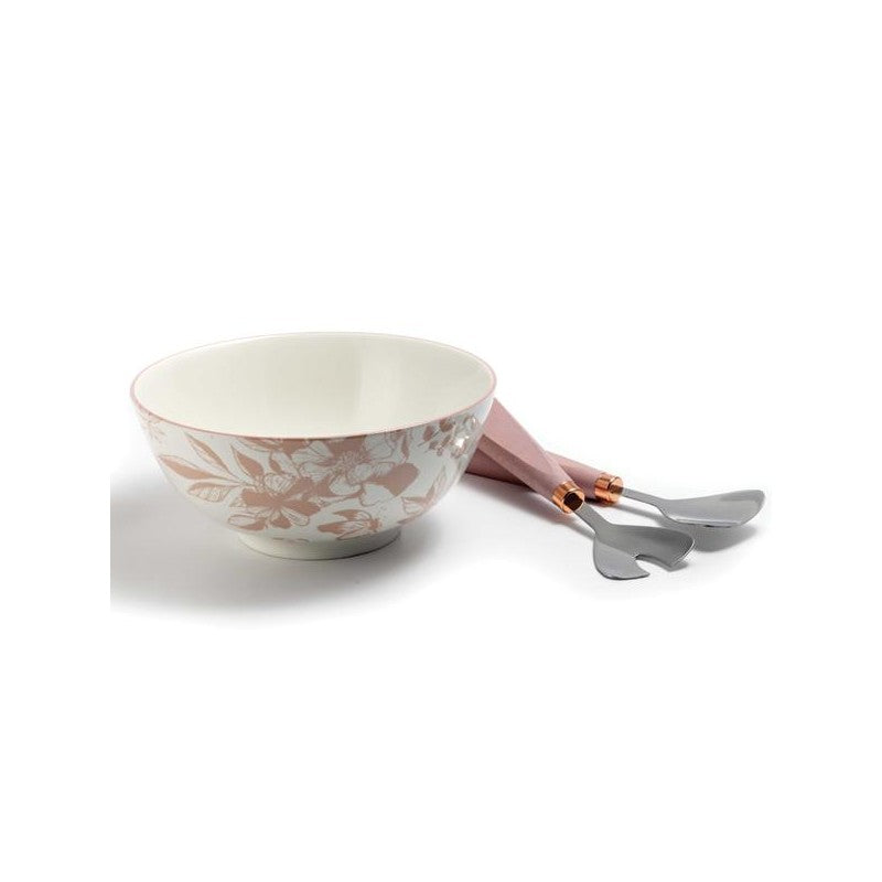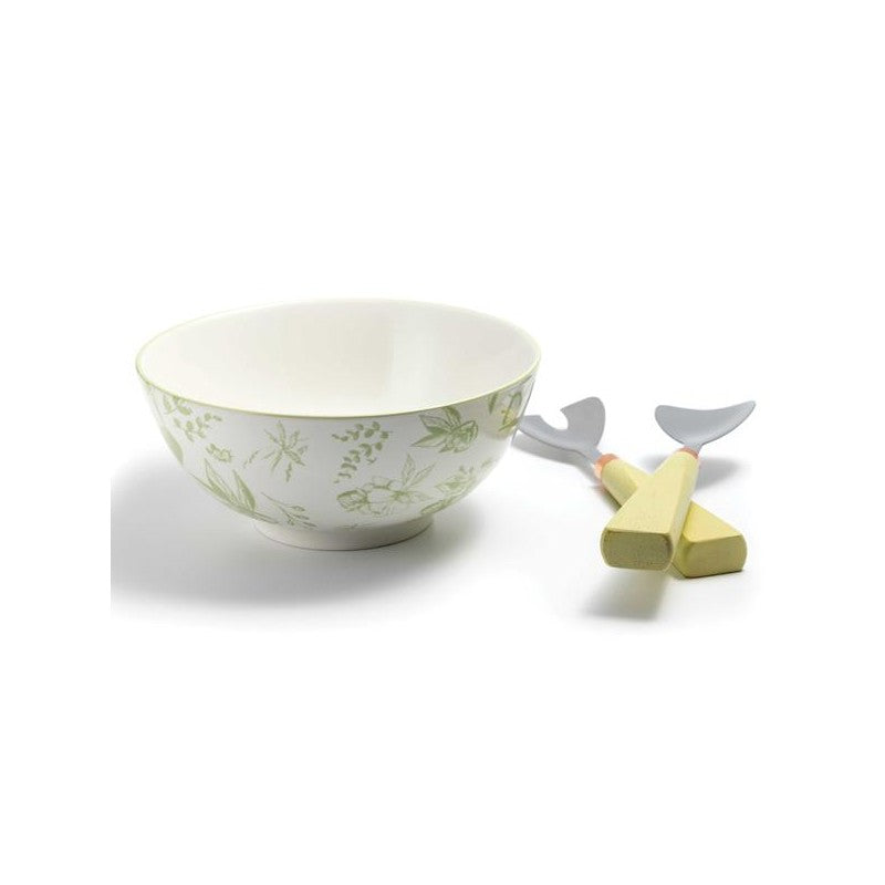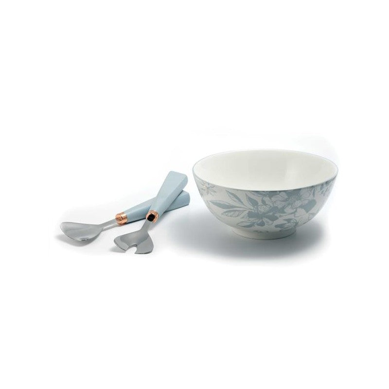 Un' elegante e raffinata insalatiera in porcellana, con decoro all'esterno e posate da insalata con manici in legno colorati. La linea Flora include l'iconica ciotola di Madrhelén nel suo campionario, questa volta con un decoro primaverile e fresco, perfetto per la tua cerimonia!