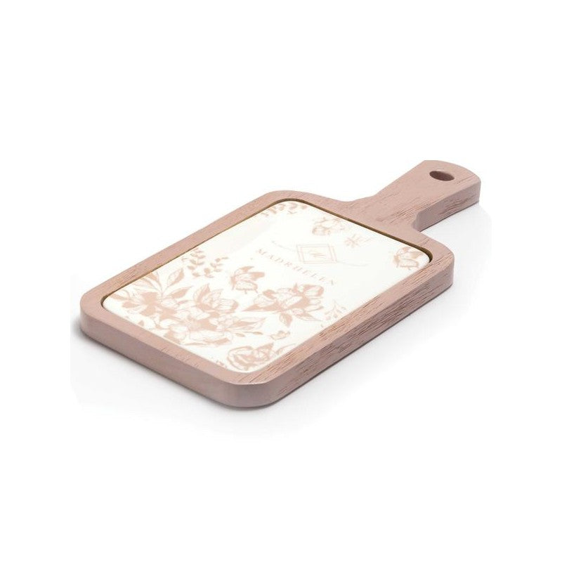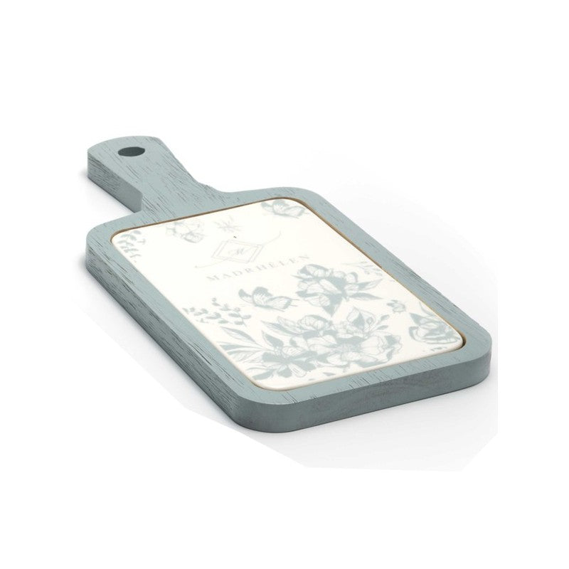 Il tagliere è rifinito in legno, con all'interno una formella in porcellana decorata nello stile della linea Flora. Ottimo anche come sottopentola!