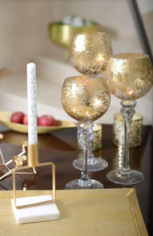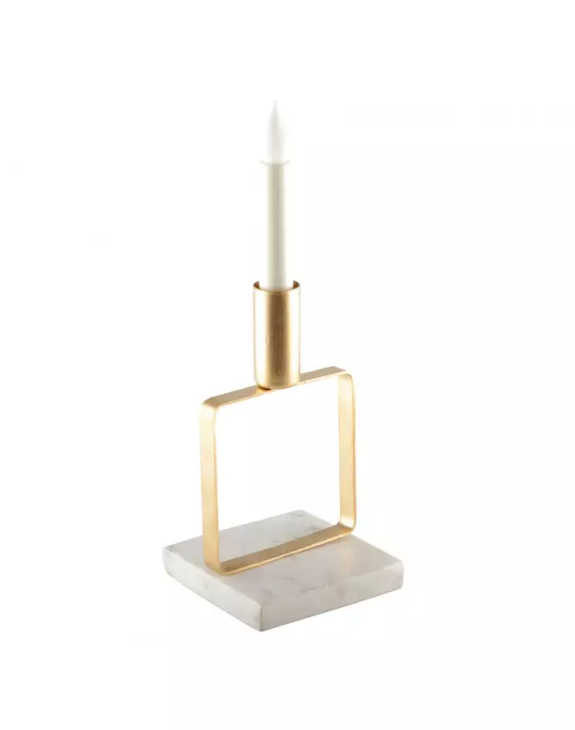 Portacandela con struttura in metallo quadrata, color oro opaco, su base marmo grigio.