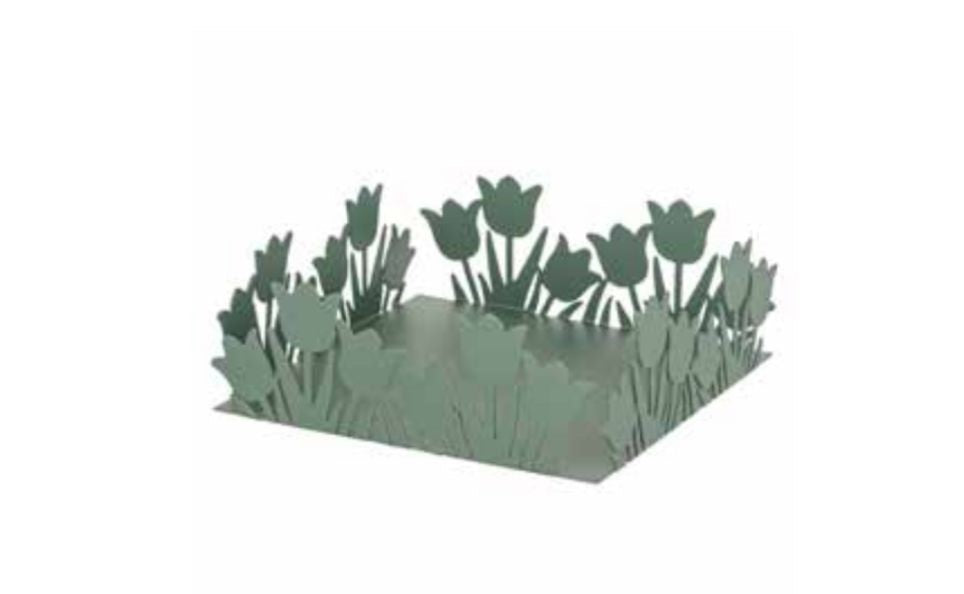 Questo portatovaglioli quadrato in metallo aggiungerà un tocco di eleganza al tuo tavolo. Realizzato in un attraente colore verde salvia, sarà perfetto per ogni occasione. Il metallo garantisce solidità mentre il design a tulipani aggiunge un tocco di raffinatezza.