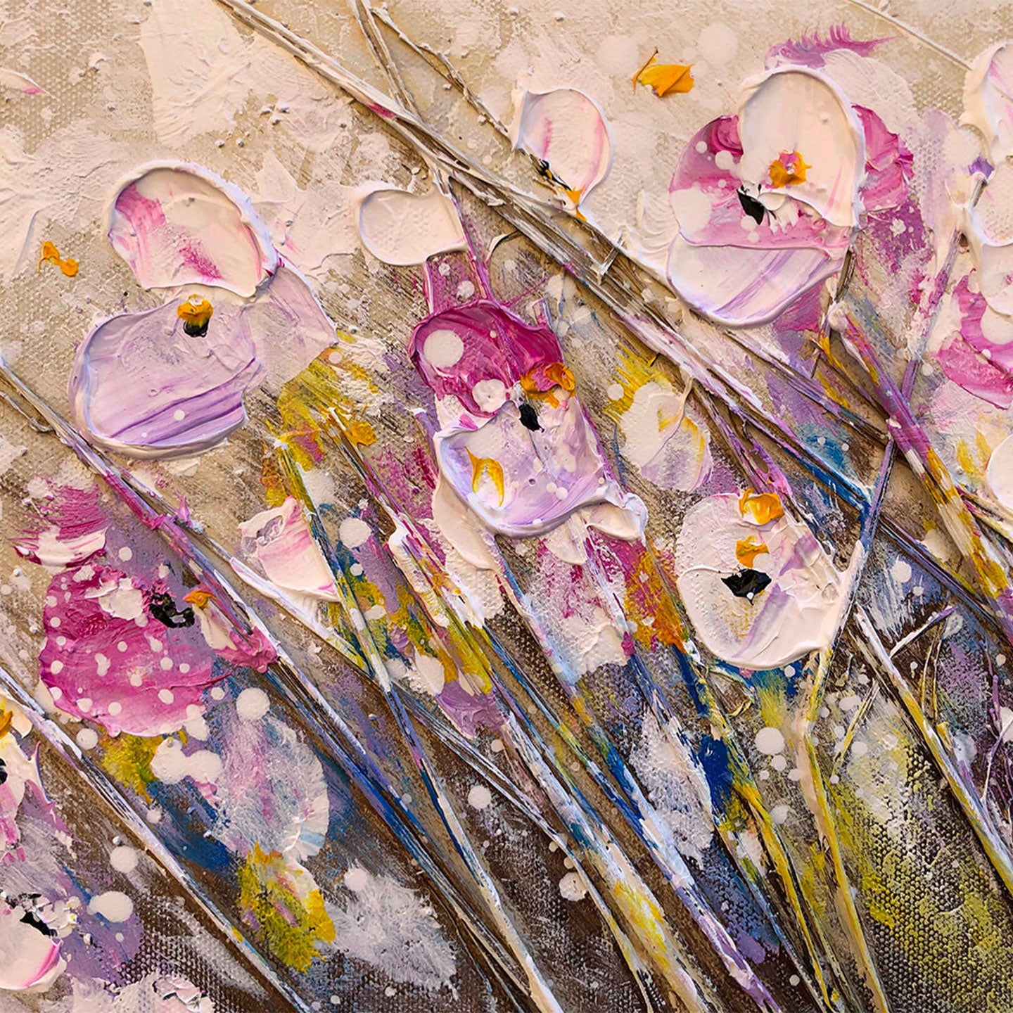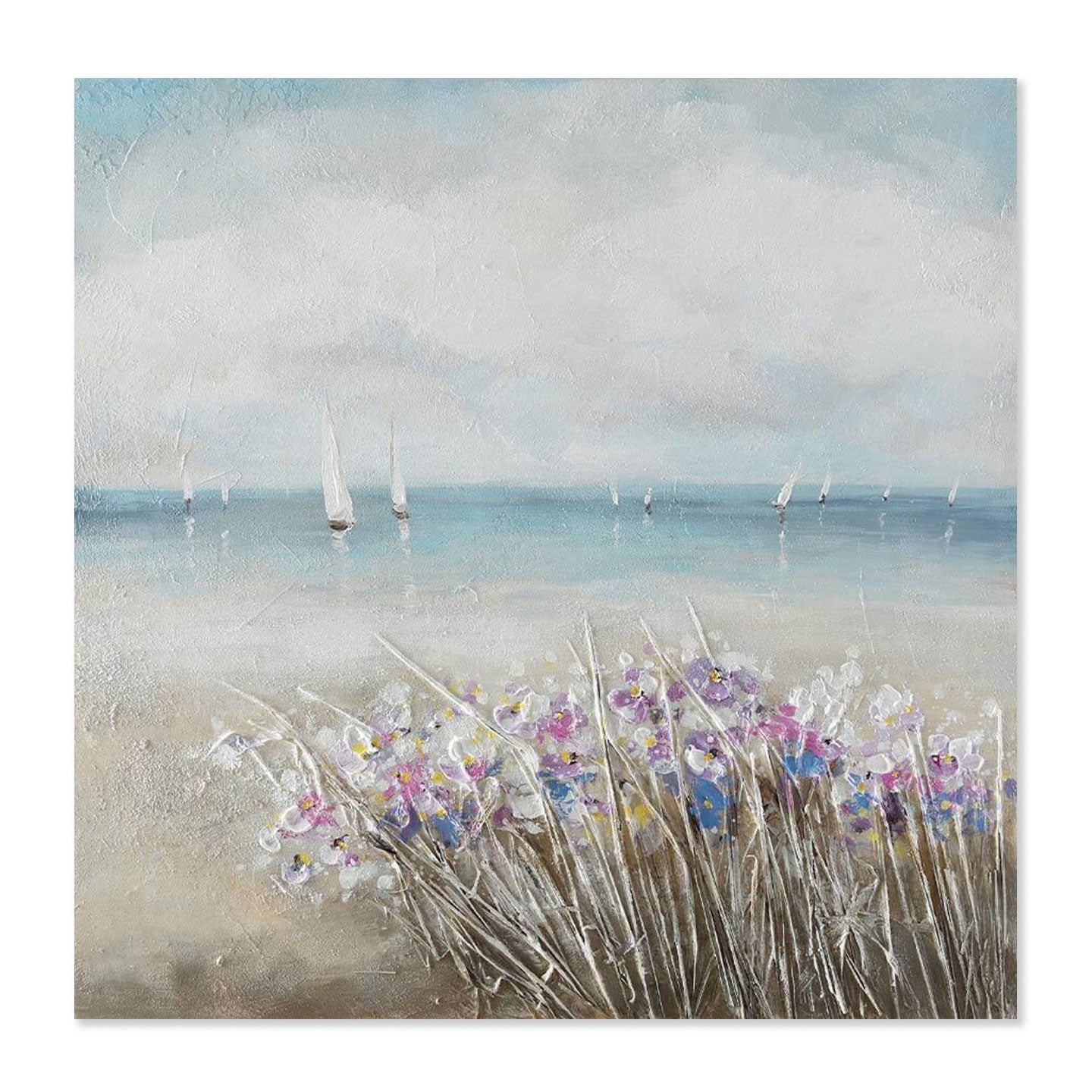Verso l’estate è un quadro marino che rappresenta fiori in primo piano e mare sullo sfondo; è interamente dipinto a mano su pregiata tela di cotone.
