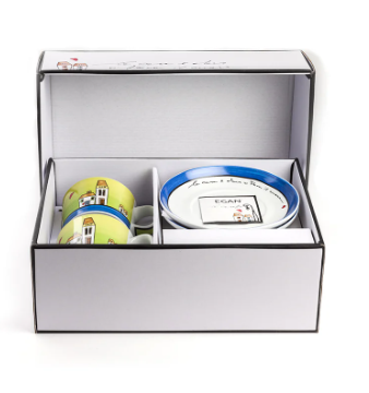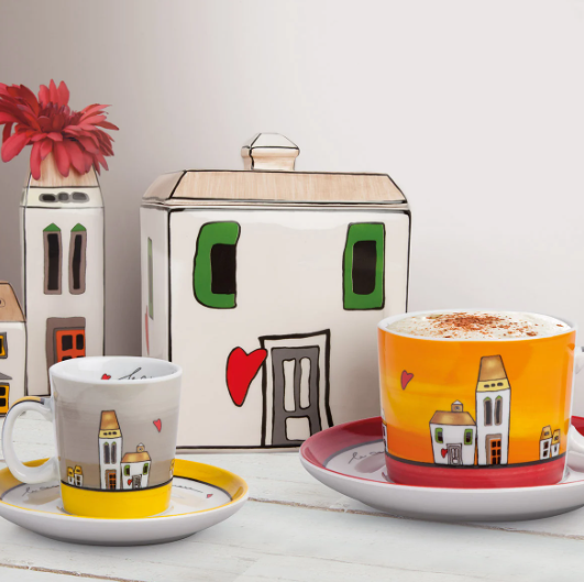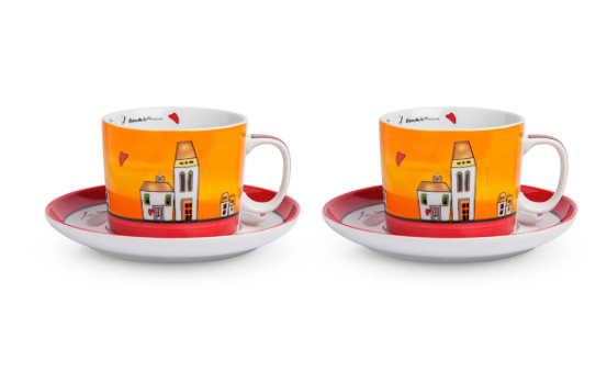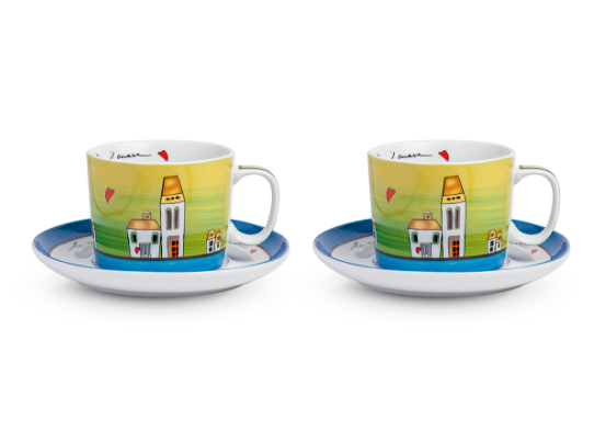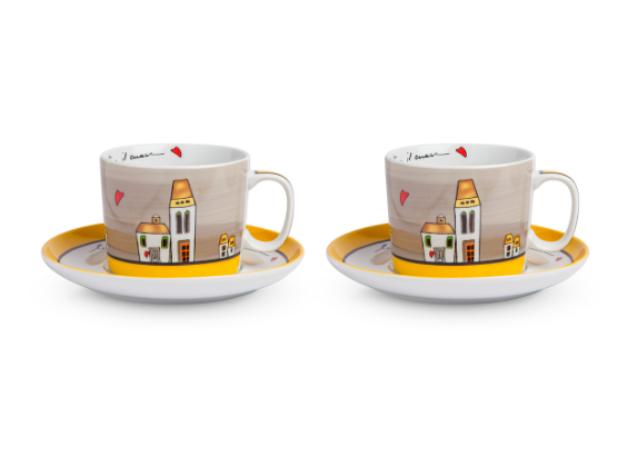 Il set comprende 2 tazze in ceramica, del diametro da 10 cm, con piattino incluso.