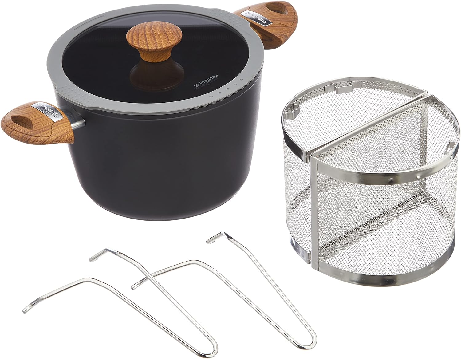 Set pasta da 22 cm multifunzione, composto da pentola, due cestelli con manici estraibili e coperchio in vetro temperato.