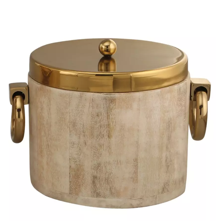 Perfetto per conservare fresche le tue bevande durante i tuoi venti o le tue feste con gli amici. Grazie al suo design in legno sbiancato e i dettagli oro dona un tocco elegante ogni tavola. Il coperchio permette di conservare a lungo il ghiaccio.