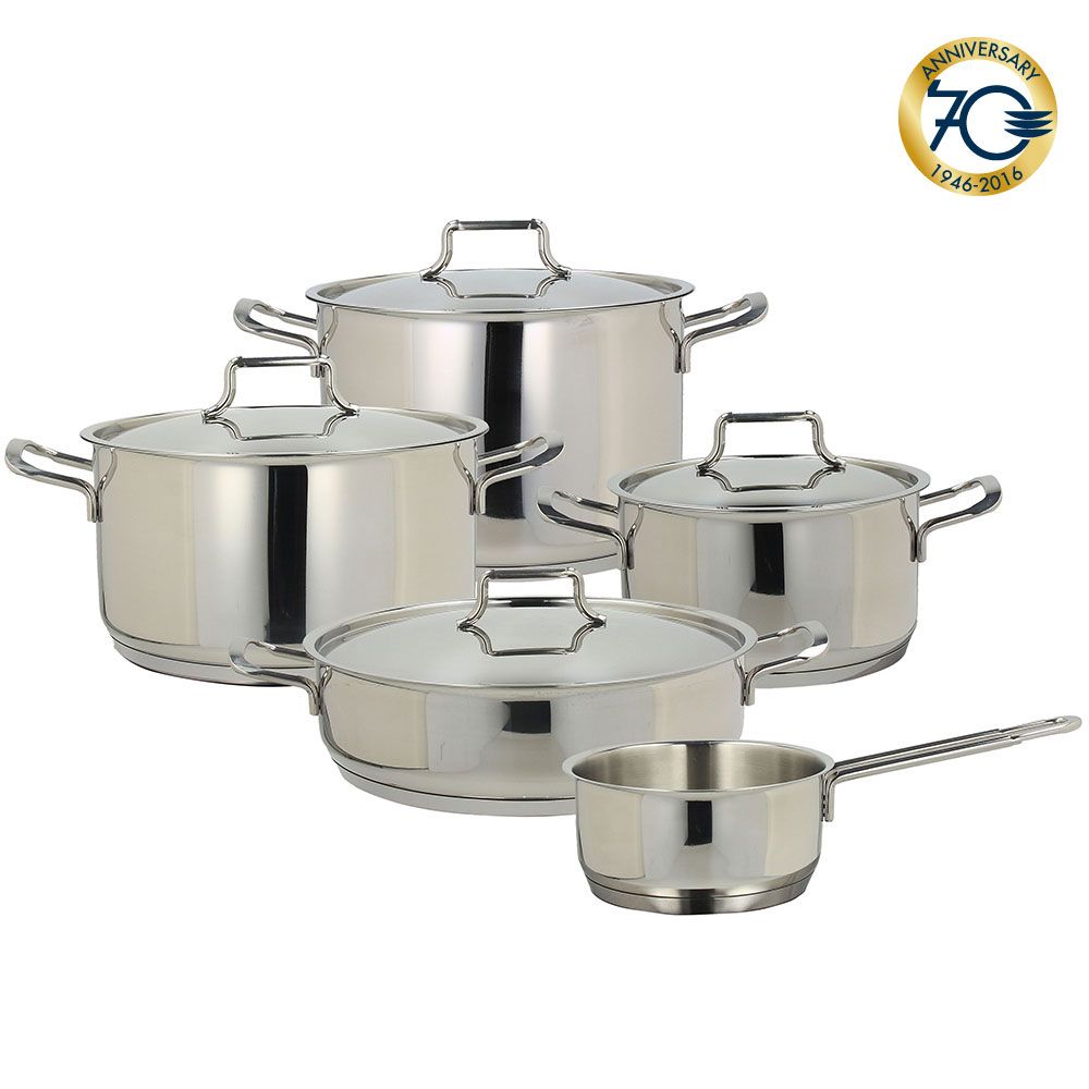 La batteria 9 pezzi della linea Vanitosa, ha un corpo in acciaio inox e presenta un fondo multistrato termoradiante acciaio/alluminio/acciaio.