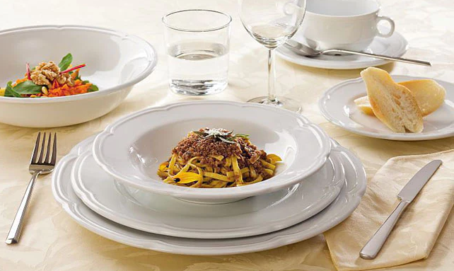 Il servizio 18 pezzi comprende: 6 piatti fondi, 6 piatti dessert, 6 piatti piani.