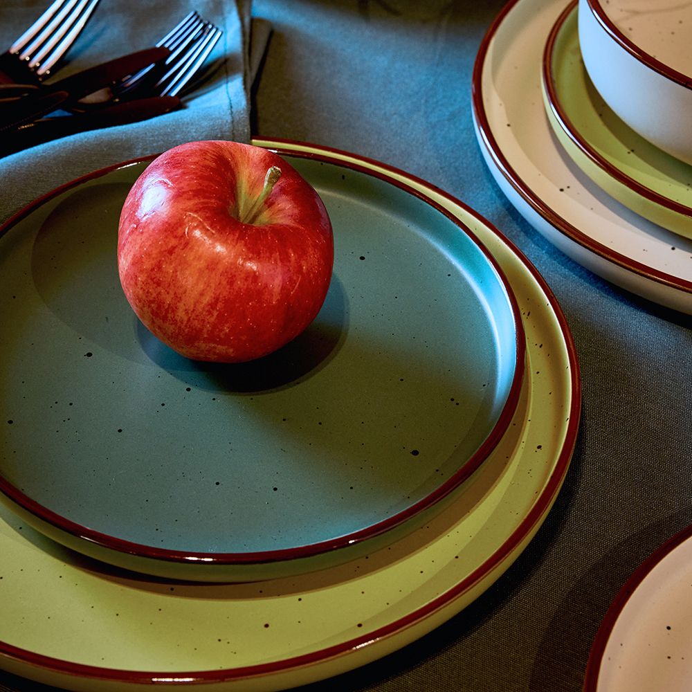 Il servizio è in porcellana ed è composto da 18 pezzi e comprende: 6 piatti piani, 6 piatti dessert, 6 piatti fondi.